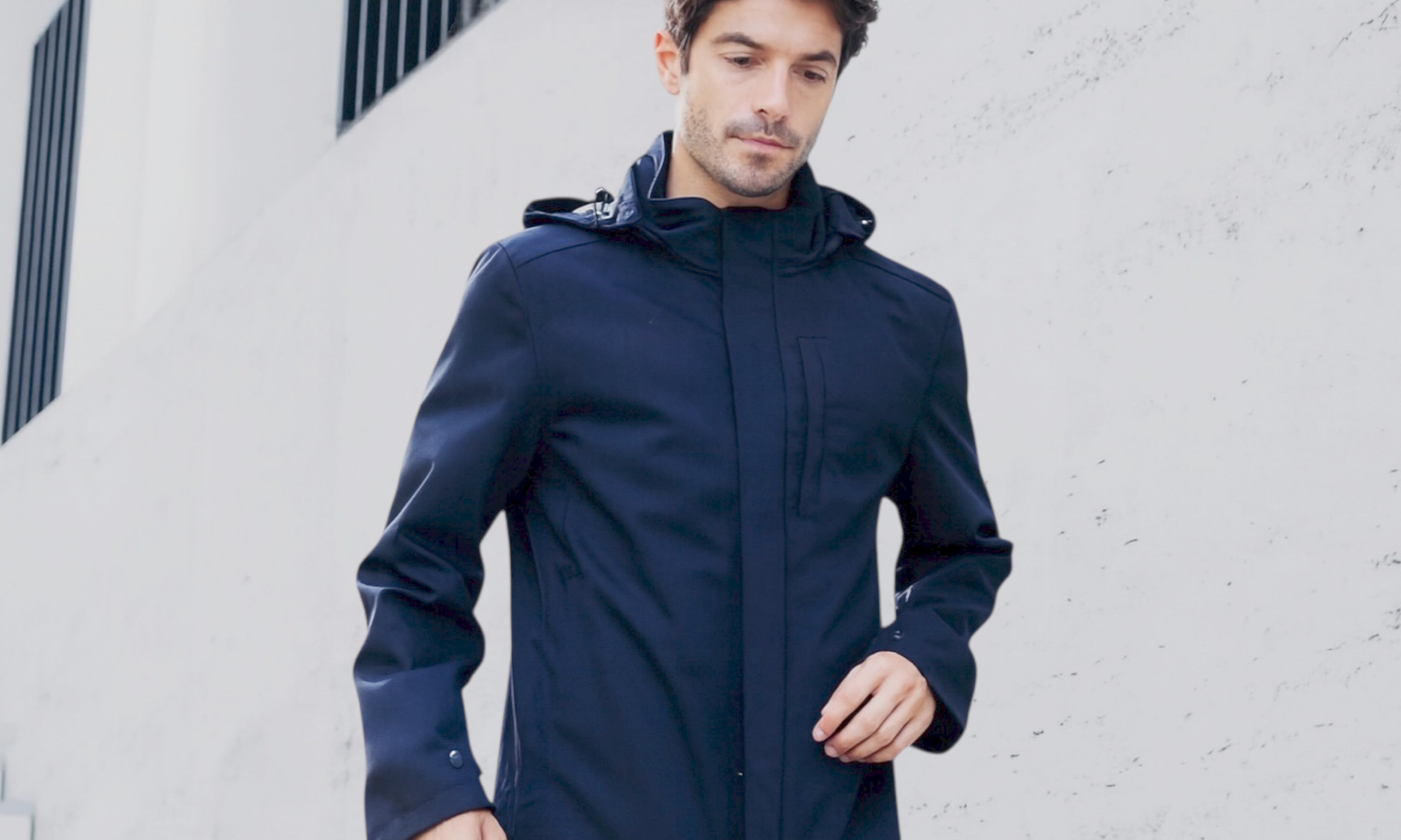 Veste moto élégante et imperméable avec une ligne pare-balles & anti-couteaux dédiée à la protection urbaine haut de gamme et discrète.